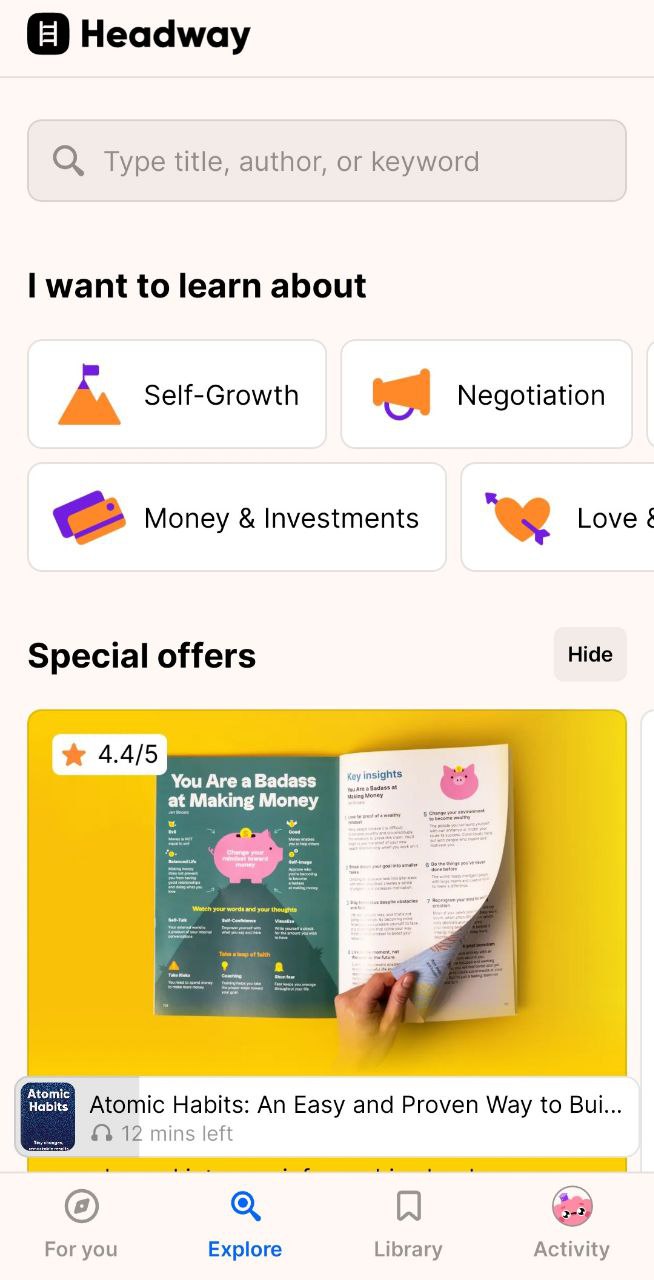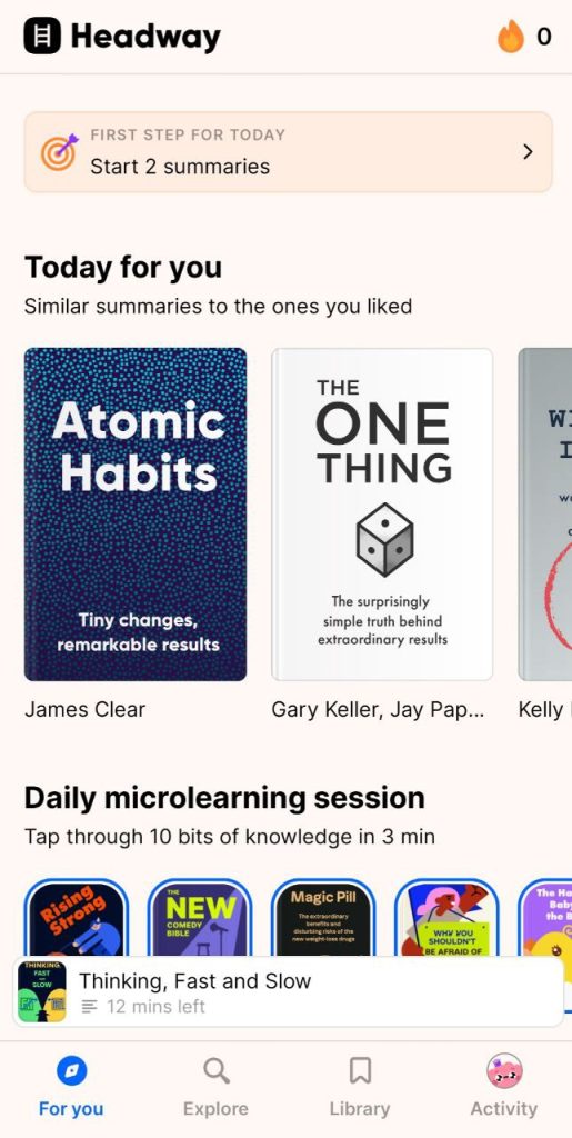 Завантаживши Headway, ви отримуєте можливість читати або слухати змістовні огляди літератури на різну тематику: психологія, кулінарія, бізнес, лідерство тощо. Усе, що треба, щоб ознайомитись із ключовими тезами книги — 15-20 хвилин. Так можна швидко вчитись чомусь новому кожного дня і вивчати англійську заразом. У Headway також є виділення цитат і додавання нотаток.