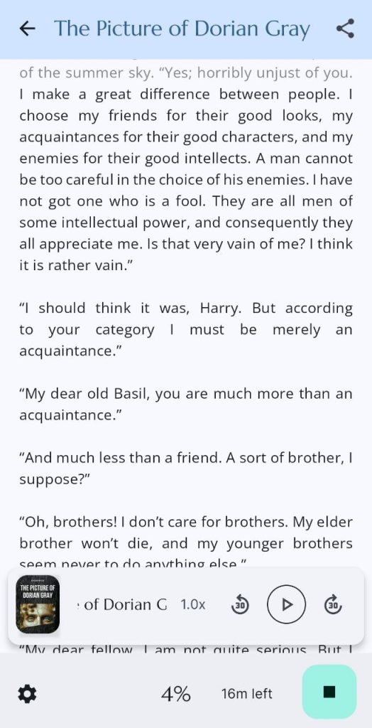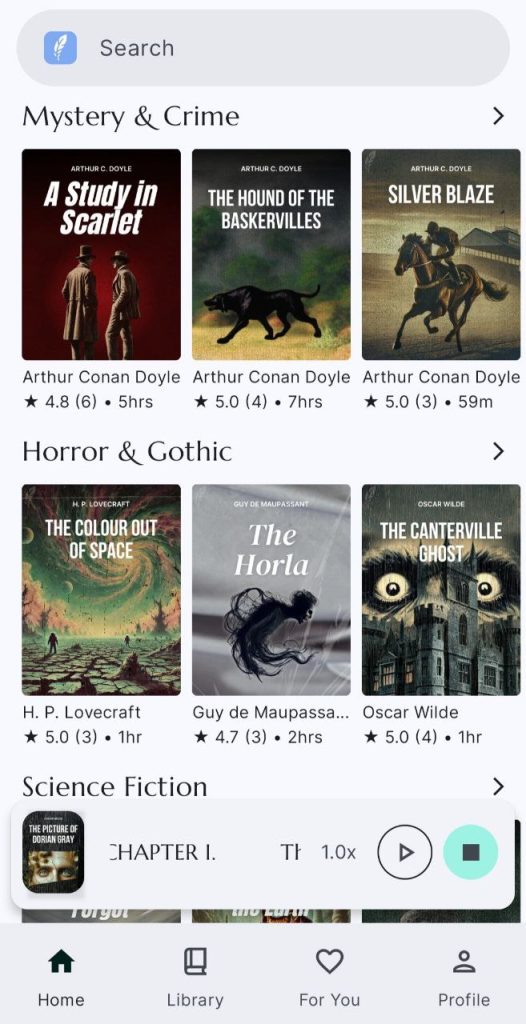 Fabuly — безкоштовний додаток, де можна читати і слухати класичні книги англійською мовою. Література доступна і в текстовому, і в аудіоформаті. У додатку можна перемикати твір з тексту на аудіо, ба навіть мати звуковий ряд і читати одночасно. Ця функція підходить для тренування мови на слух і читання заразом. Так згодом покращується розуміння англійської вимови.