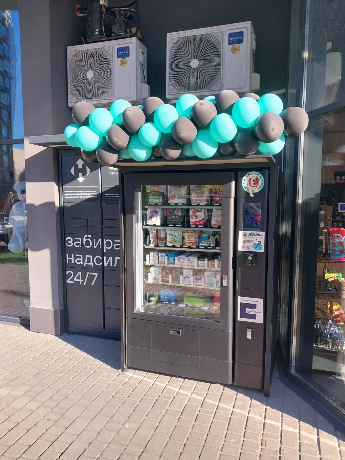 Назвали мопсоматом, бо магазин називається «Шалені мопси», автомати стоять поруч, тож відповідно і отримали таку назву. Мопсомат — звичайний торговельний апарат, в якому людина може придбати основний сегмент товарів для улюбленця та розрахуватися карткою. Це доступно 24/7, в чому і полягає його основне завдання.